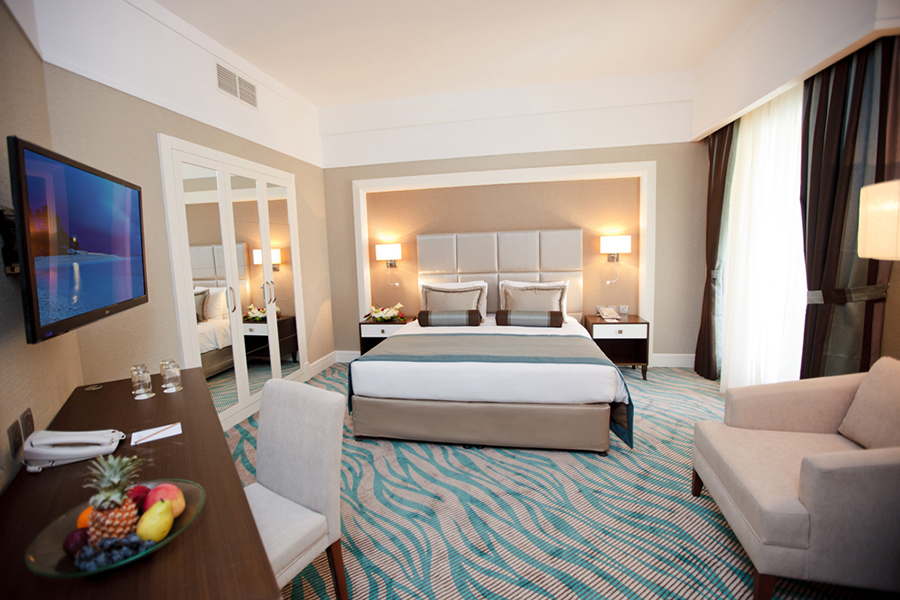 Izby zariadené v príjemných farbách s tradičnými tureckými prvkami sú priestranné, majú francúzsky balkón a výhľad na areál hotela, alebo na more. K vybaveniu patrí klimatizácia, veľká LED TV, písací stôl, posedenie, minibar, trezor, telefón, set na prípravu čaju/kávy, kúpeľňa so sprchou a WC, sušič vlasov, župany, papuče a toaletné potreby. Internet je dostupný cez Wi-Fi.