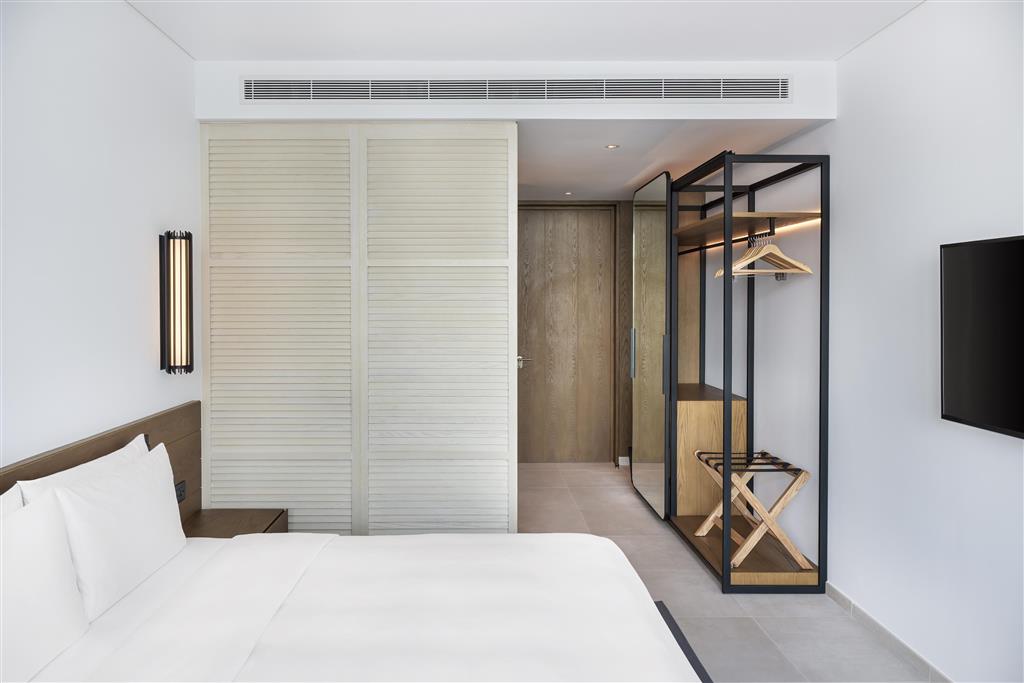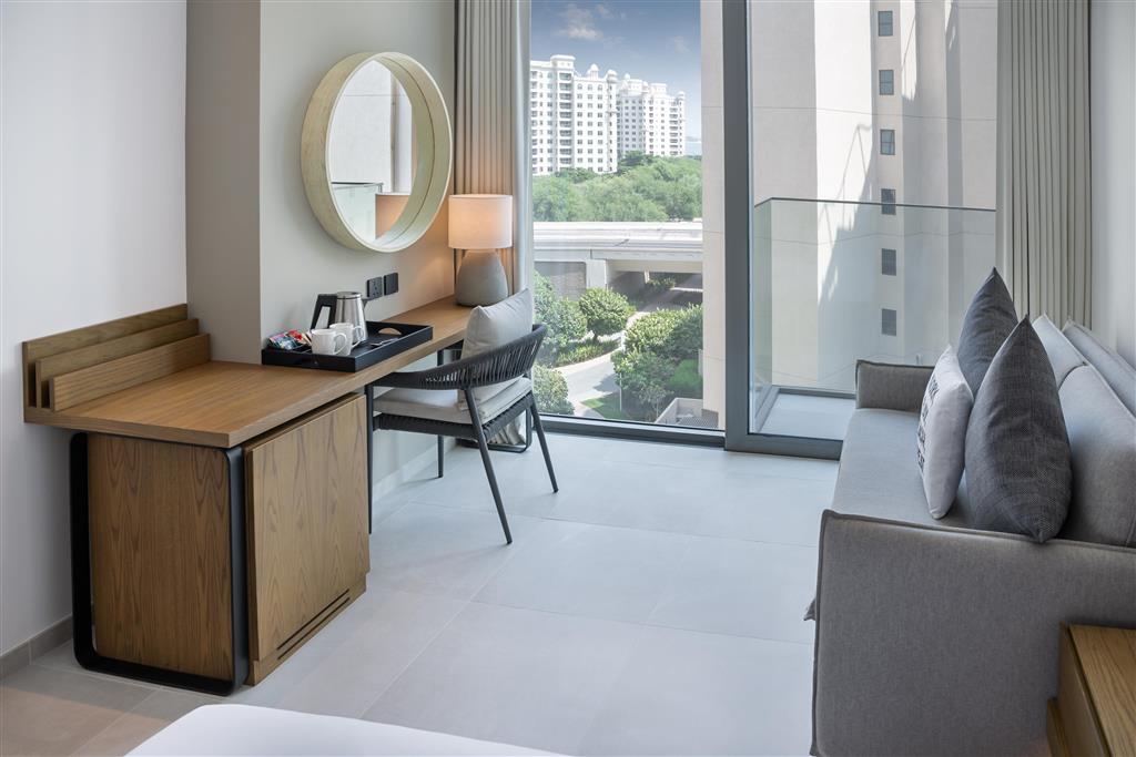 Dvojlôžková izba, superior, výhľad palma : kúpeľňa/WC, klimatizácia, TV/sat., set na prípravu kávy a čaju, minibar, trezor, žehlička a žehliaca doska, balkón, jedna posteľ veľkosti King alebo dve Twin, Wifi zdarma, výhľad na mesto, 32m2.