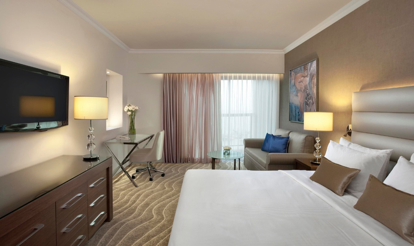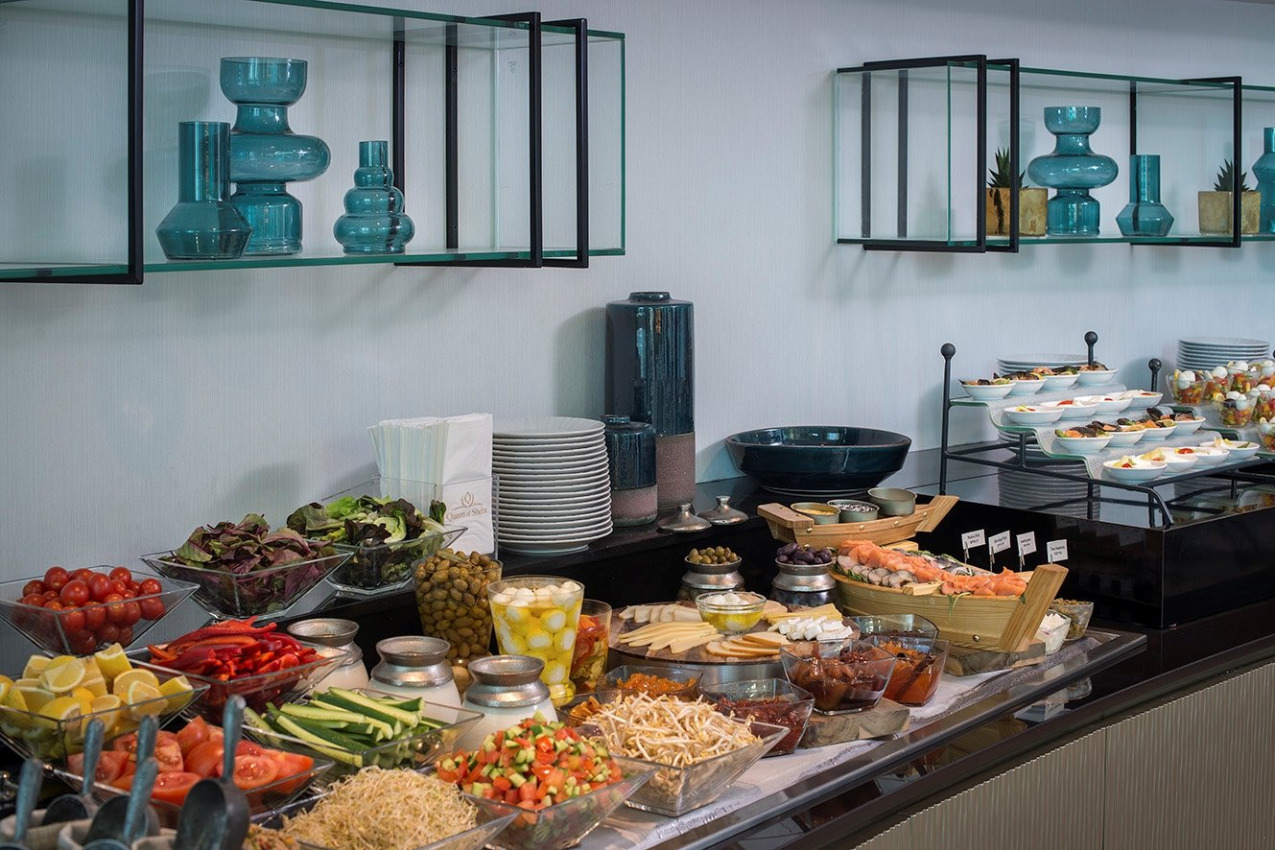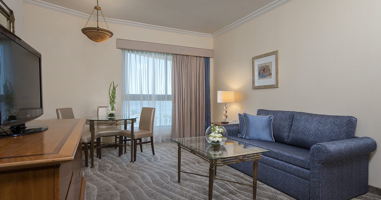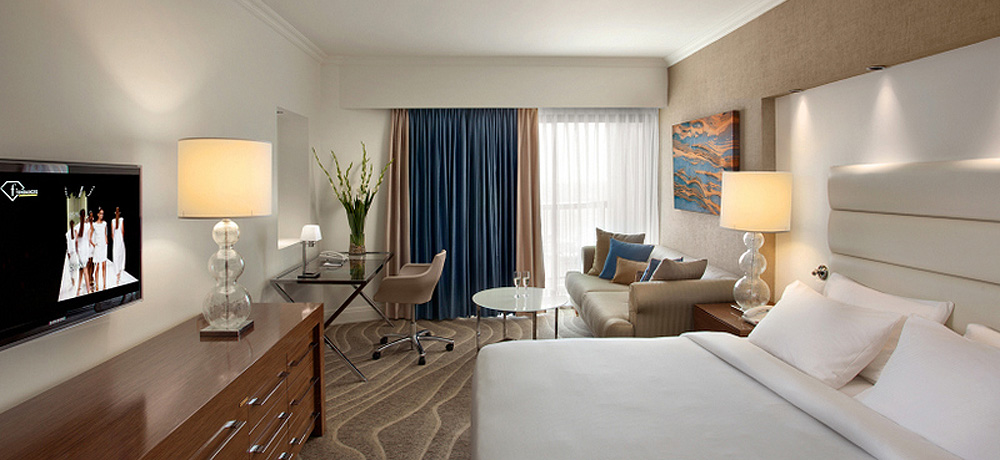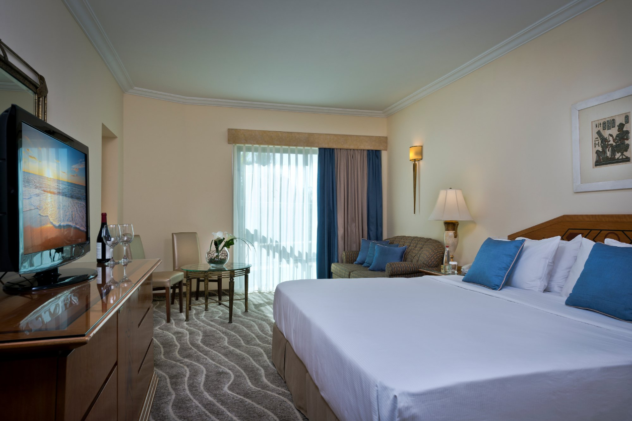Vybavenie izieb: kúpeľňa s WC, sušič vlasov, posteľ typu King size, gauč, klimatizácia, telefón, TV, rádio, trezor, minibar, Wi-Fi pripojenie. V základnej cene izba Deluxe. Na vyžiadanie a za príplatok je možné ubytovanie vo vyššom štandarde (Sheba Suites with square Jacuzzi, Premium Rooms, Executive Rooms, Junior Suite, Family Suite, Plaza Suite, Queen of Sheba Suite).