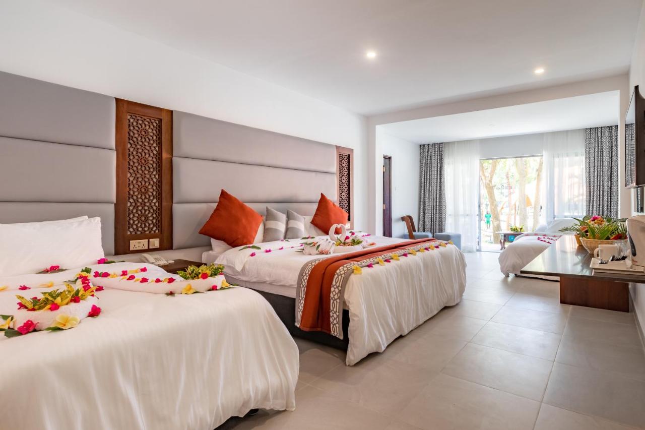 Vybavenie izieb: izby s výhľadom do záhrady alebo na bazén, niektoré bližšie k pláži majú výhľad na indický oceán. V každej izbe je k dispozícii kúpeľňa s WC, sušič vlasov, klimatizácia, moskytiéra, telefón, TV a DVD, Wi-Fi pripojenie, trezor za poplatok, minichladnička, set na prípravu kávy a čaju, balkón so sedením. V základnej cene izba Superior s výchľadom do záhrady alebo na bazén. Izby typu Superior deluxe, Ocean front ,Ocean front deluxe na vyžiadanie a za príplatok.