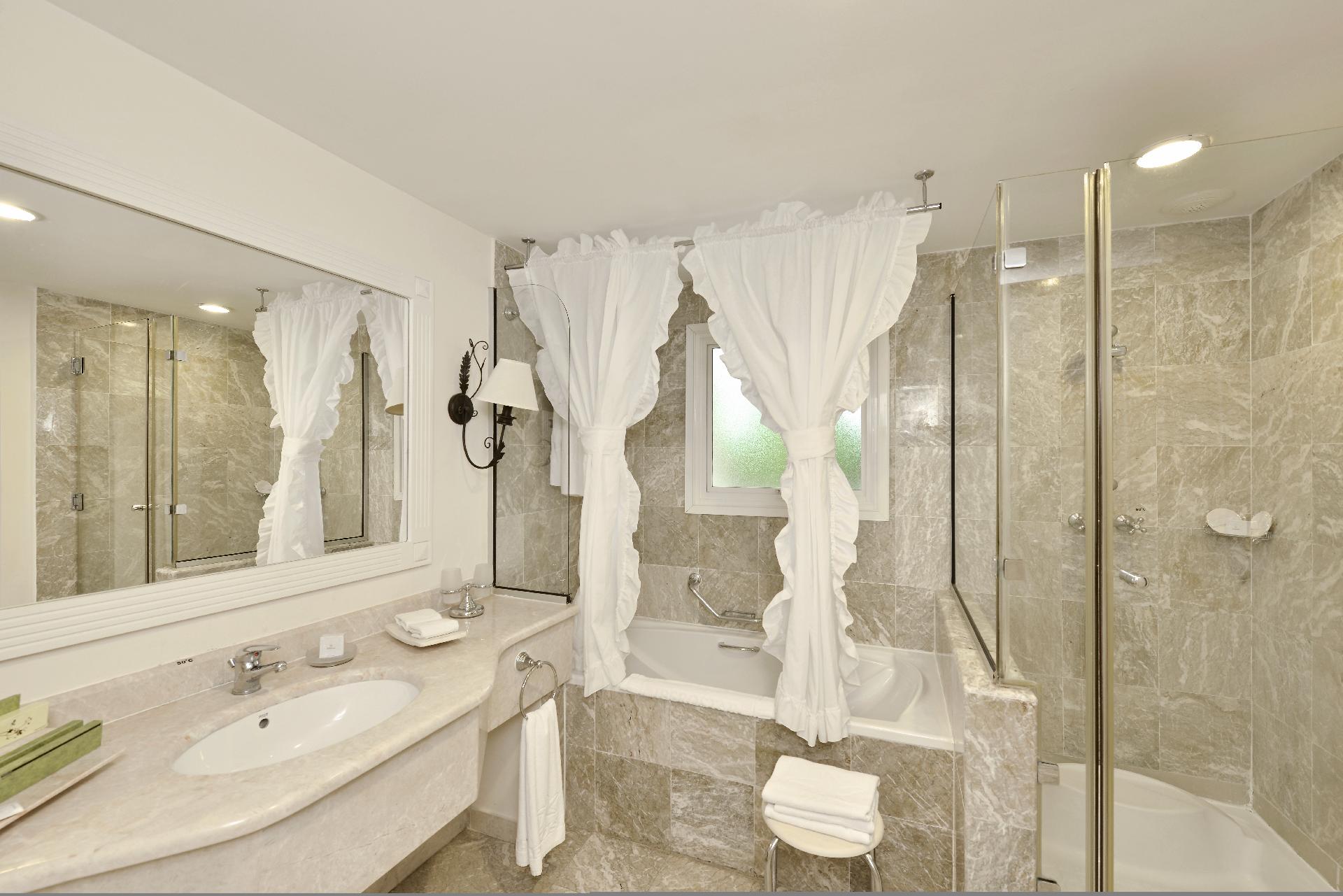 Hotelový apartmán zasazený do okolní zeleně je nabízen v rámci programu All inclusive a doporučen především pro rodiny s dětmi. K pokoji náleží rozlehlá terasa nebo balkon s nádherným výhledem do parku. V koupelně hosté naleznou vanu i sprchu, vysoušeč vlasů. Samozřejmostí je telefon, TV se satelitem, DVD a CD přehrávač, domácí kino, kávovar, sejf, žehlička a žehlicí prkno. Pokojový minibar je v rámci All inclusive denně zásoben lahodnými drinky.