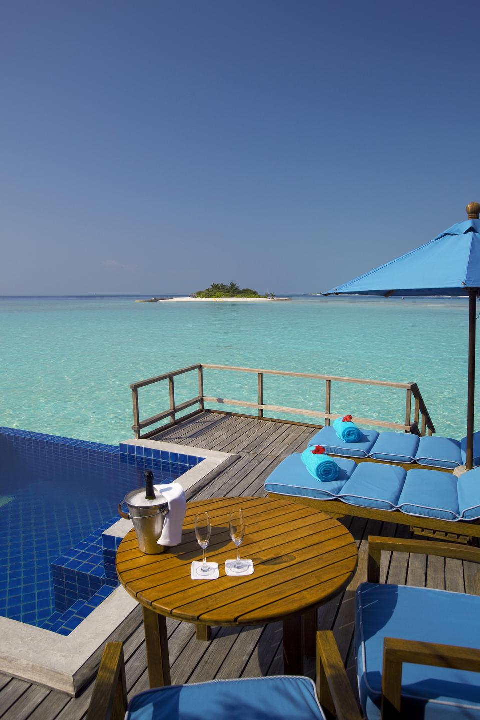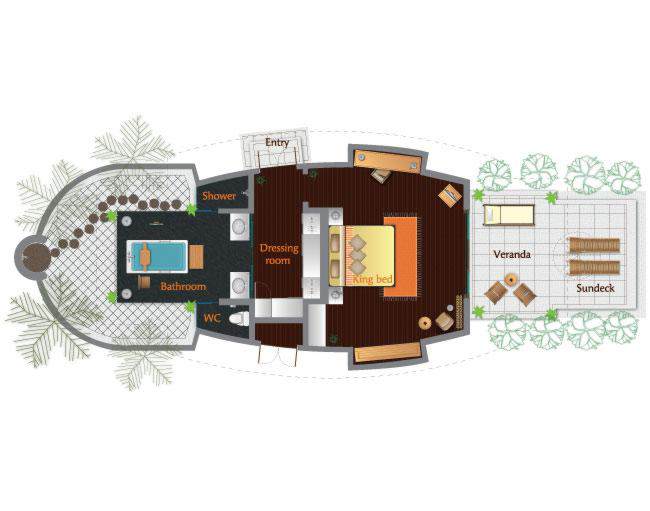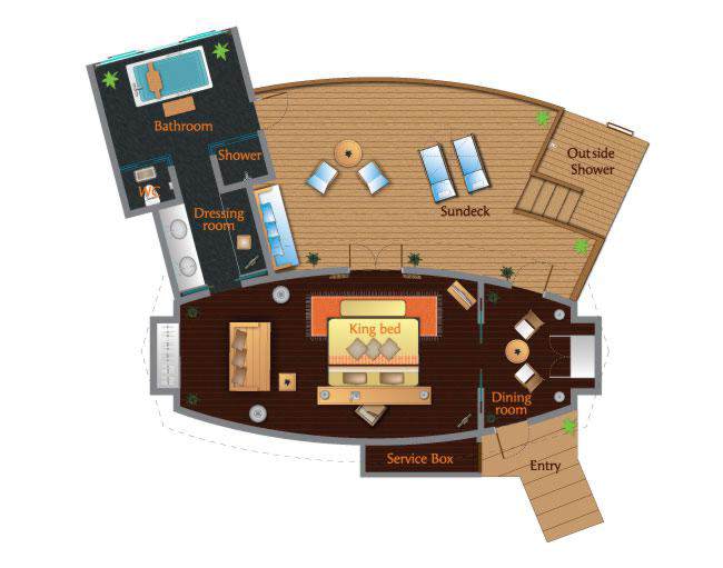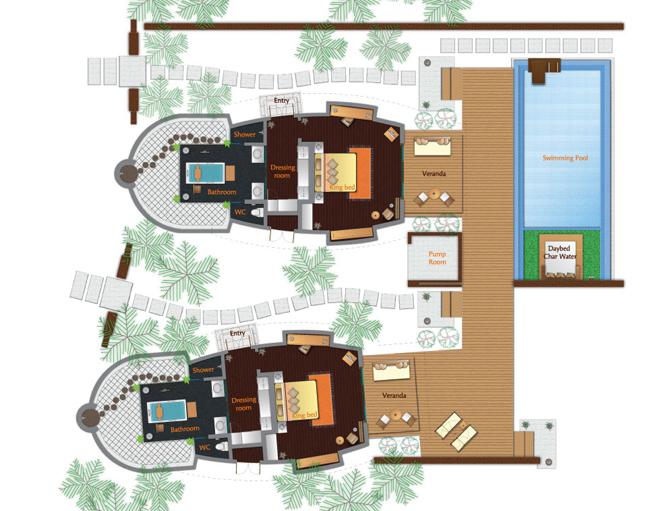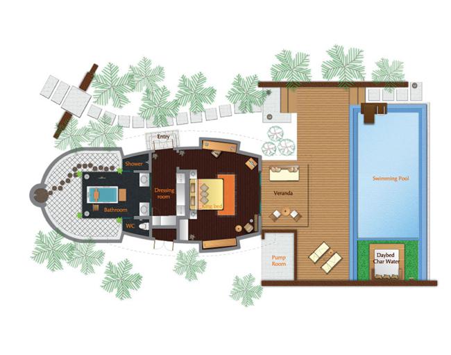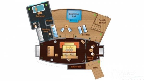 Exkluzivní apartmá postavené nad vodní hladinou má elegantně zařízený obývací prostor a venkovní terasu se soukromým bazénem a výhledem na západ slunce. Dekorace je v maledivském přírodním stylu a apartmá je vybaveno manželskou postelí, jídelnou, vanou, plochou satelitní TV, CD/DVD přehrávačem, iPod stanicí a minibarem.