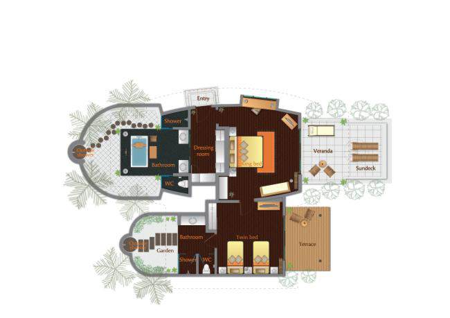 Dvě částečně propojené vilky umožňují ubytování pro velkou rodinu či skupinu přátel. Jsou umístěny přímo na pláži a sdílejí společnou cestu, která vede na terasy obou vilek. Do vybavení patří soukromý bazén, venkovní koupelna s vanou, manželská postel, šatna, plochá satelitní TV, CD/DVD přehrávač, iPod stanice, internetové připojení a minibar.