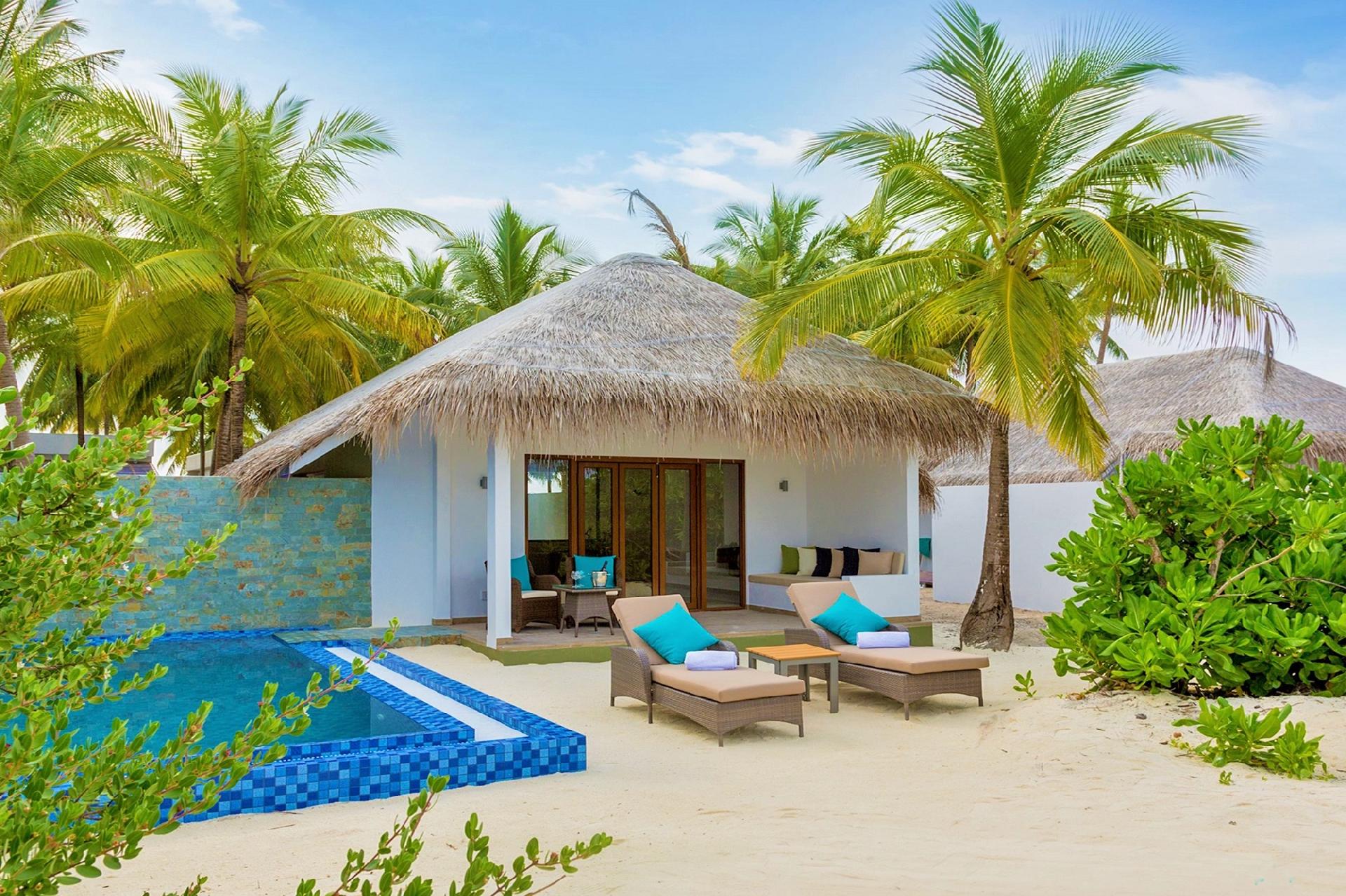 Suity s privátnym bazénom priamo pri pláži sú priestranné, štandardne vybavené king-size posteľou, pohovkou, minibarom a ďalším vybavením, vrátane Wi-Fi pripojenia zdarma. V zadnej časti suity sa nachádza moderná open-air kúpeľňa s veľkou otvorenou sprchou. Pred suitou je zariadená terasa s pohovkou, posedením a menšou hojdačkou.