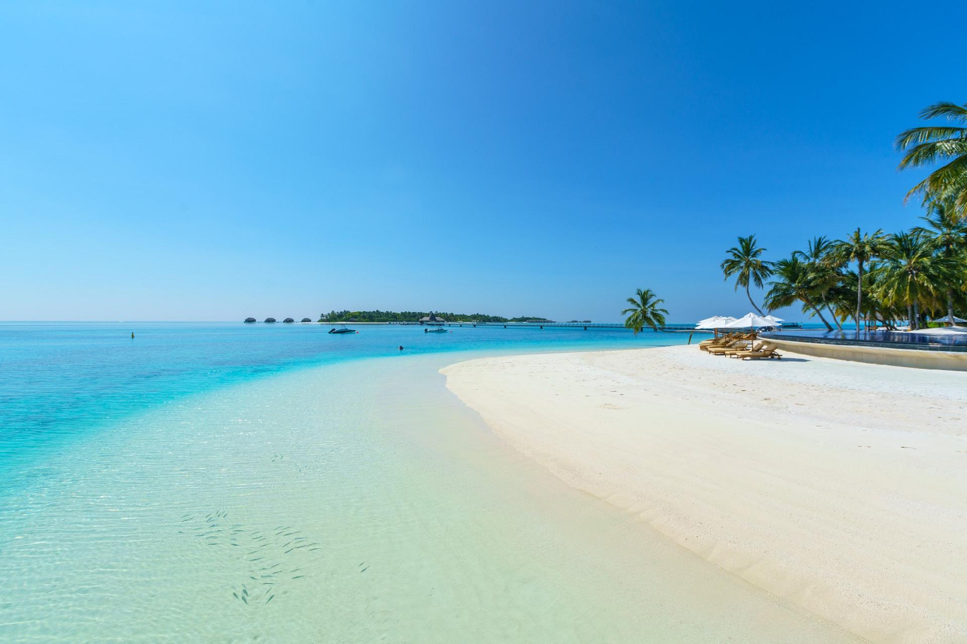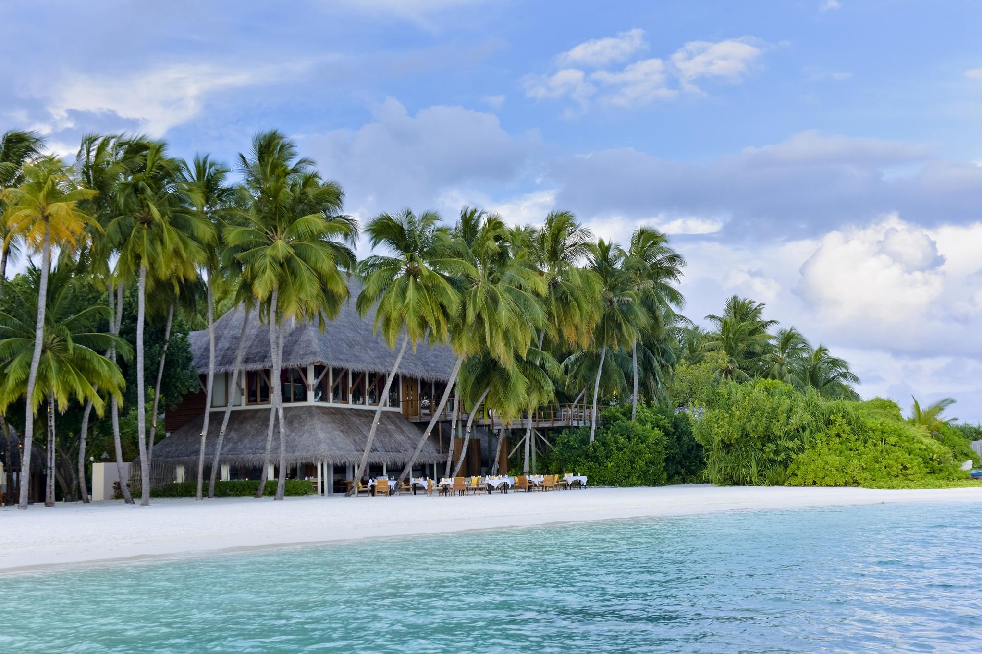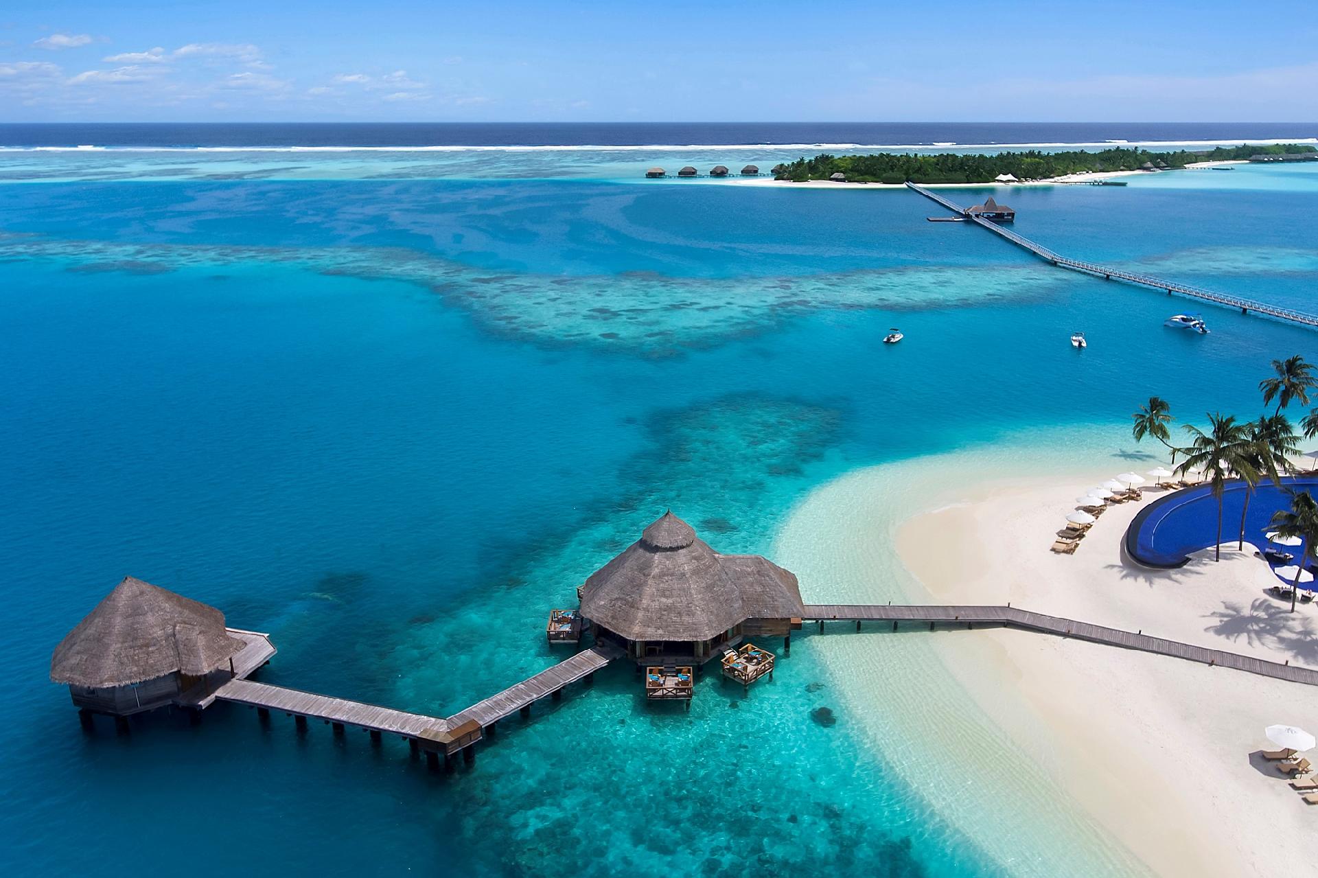 POPIS: jeden z najluxusnejších rezortov na Maledivách. Rozprestiera sa na dvoch ostrovoch: Rangali Island (750 x 75 metrov) a Rangalifinolhu (650 x 350 metrov) prepojených chodníkom a obklopený hlbokou modrou lagúnou s dramatickým koralovým útesom. Pozostáva zo 79 plážových viliek a 71 viliek nad vodou (za príplatok). Vzdialený 100 km od letiska v Malé a transfer hydroplánom trvá asi 30 minút.