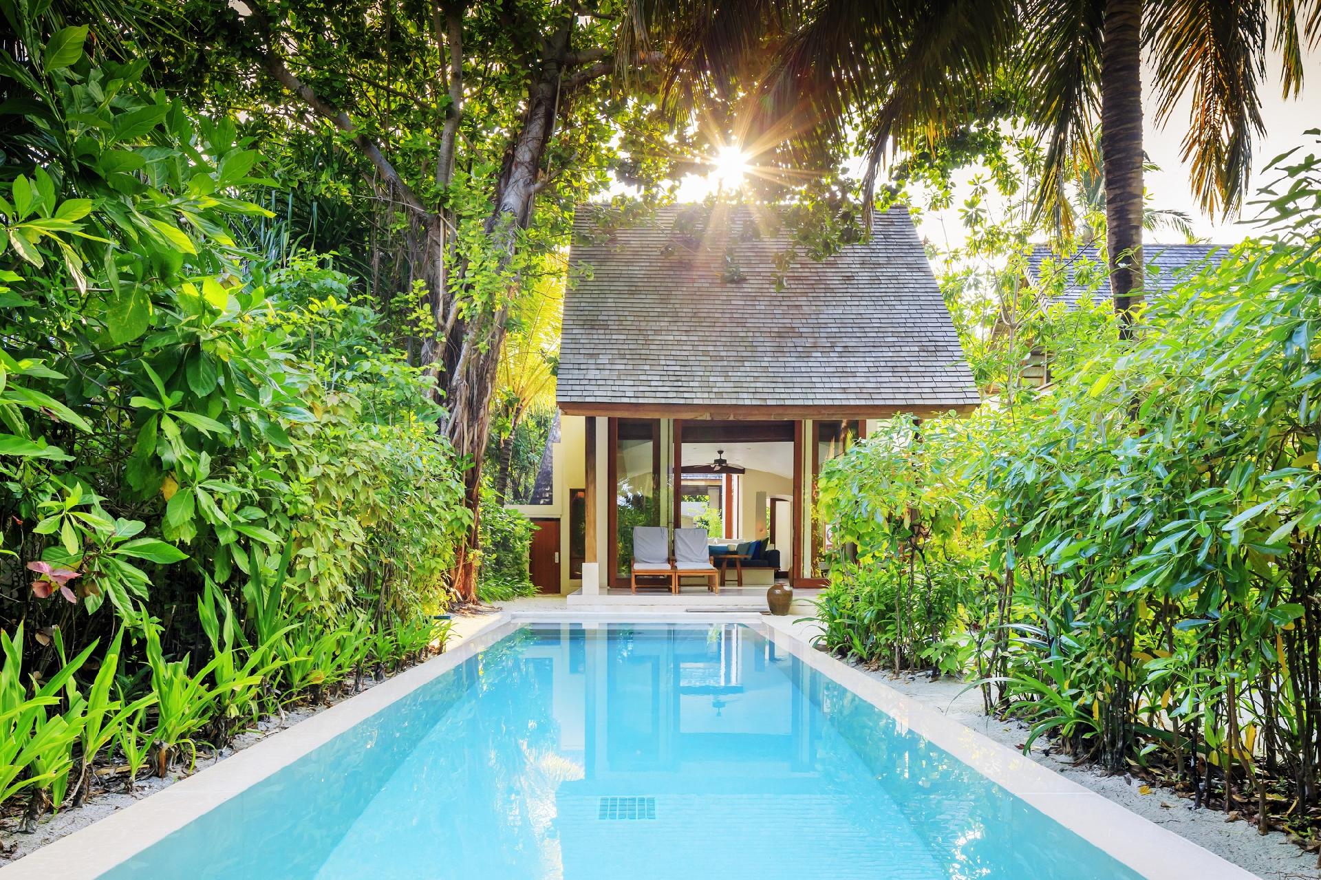 Vila priamo na pláži so súkromným bazénom. Zo spálne je výhľad do tropickej záhrady. V kúpeľni sa nachádzajú dve umývadlá, vonkajšia aj vnútorná sprcha a open-air odpočíváreň.