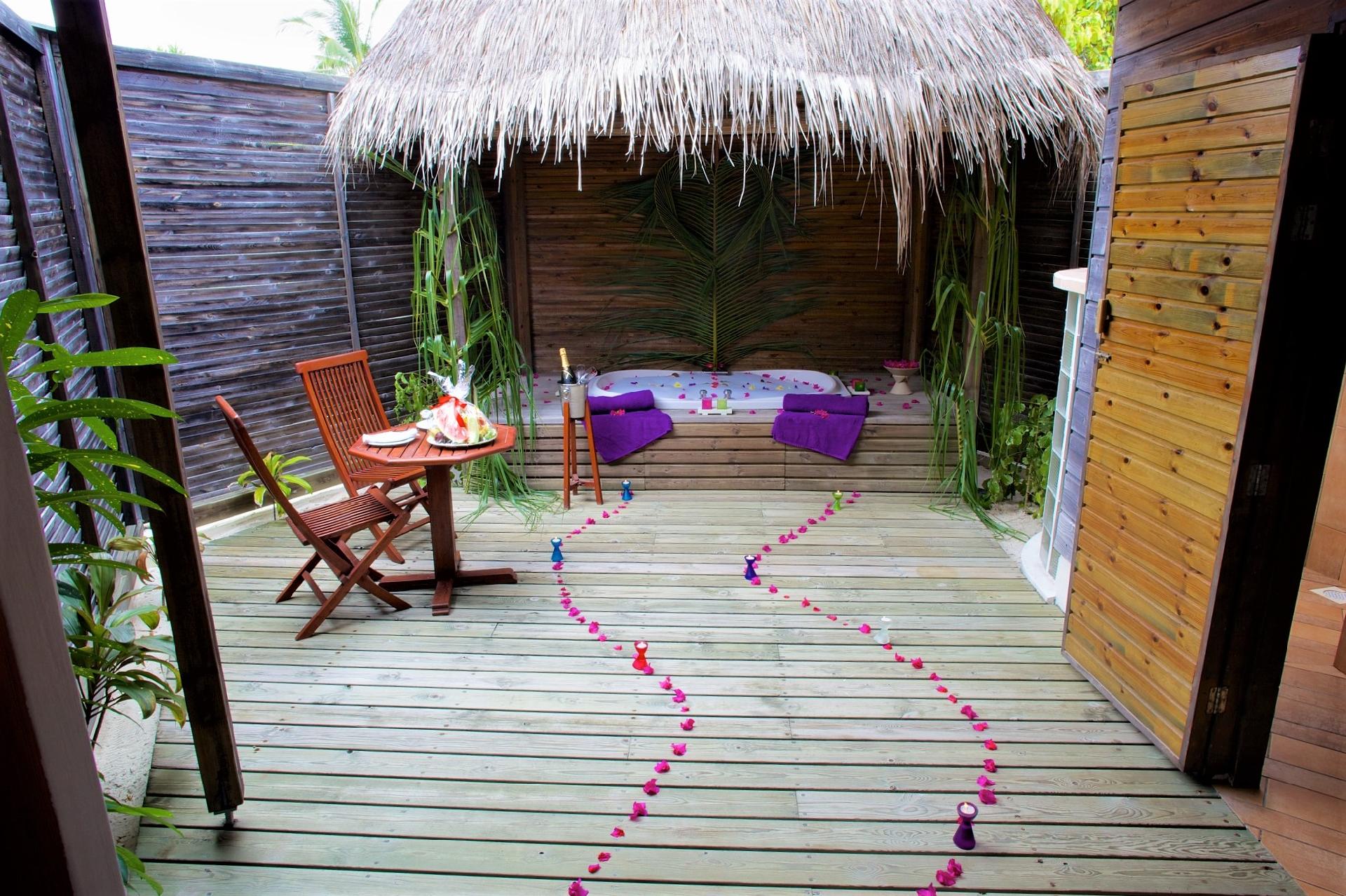 Plážové vily s privátnou vonkajšou jacuzzi. Vila disponuje spálňou s manželskou posteľou, relaxačnou časťou s posedením, open-air kúpeľňou a ďalším štandardným vybavením ako klimatizácia, Nespresso kávovar so setom na prípravu kávy a čaju, minibar, trezor, fén na vlasy a terasa s posedením a ležadlami na opaľovanie a vínna chladnička.