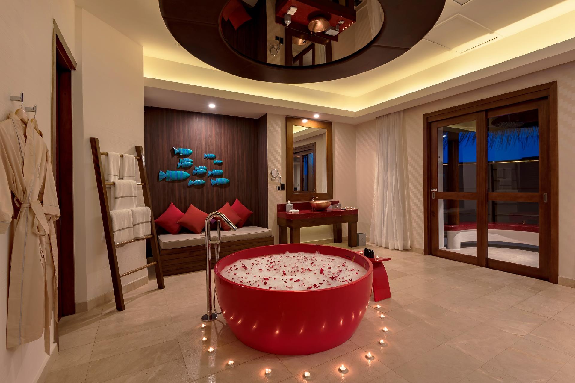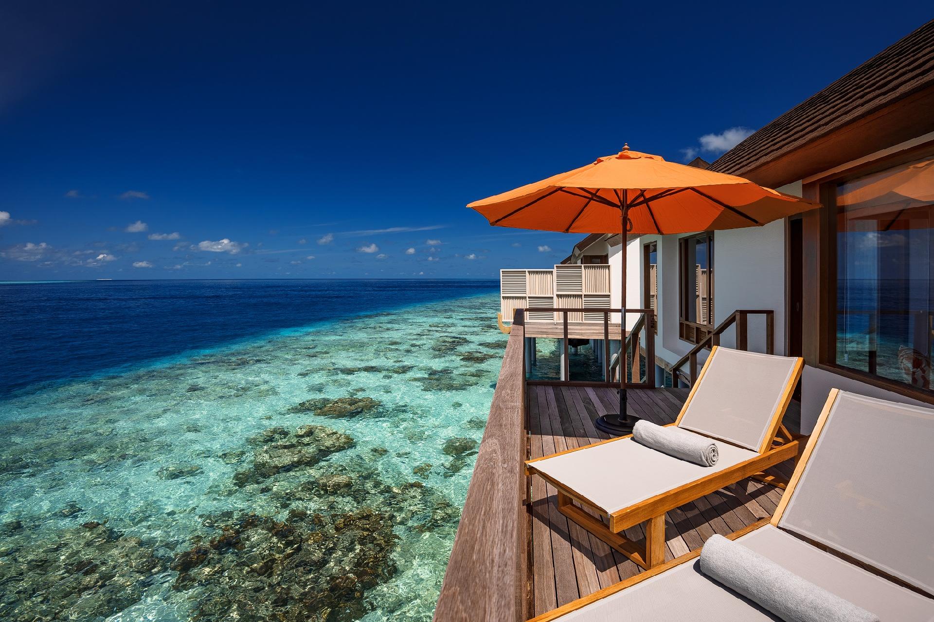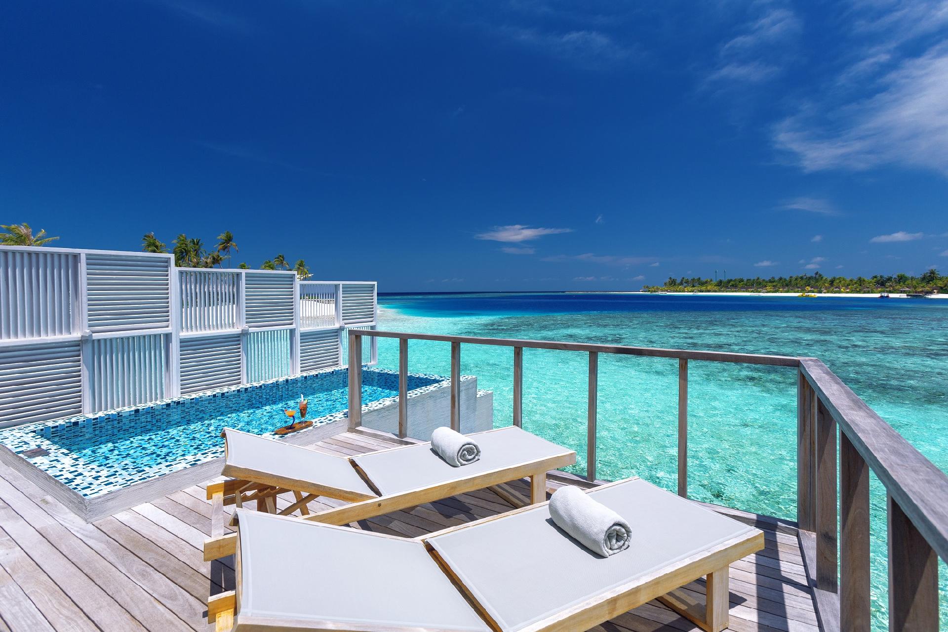 Exkluzívna, privátna, romantická vila priamo nad morom s 13 m2 veľkým súkromným bazénom ideálna pre páry a novomanželov. Izby sú veľmi vzdušné a priestranné. V spálni sa uprostred nachádza veľká okrúhla posteľ, za ňou pohovka a presklená časť podlahy. Ďalej sa tu nachádza ďalšia pohovka, minibar a samostatná miestnosť so šatníkom. V kúpeľni sa nachádza pohovka, dve umývadlá, samostatne stojaca okrúhla vaňa a vonkajšia sprcha priamo nad morom. Na drevenej terase sa nachádzajú ležadlá na opaľovanie, slnečník, pohovka pod prístreškom, bazén a schodíky priamo do mora.