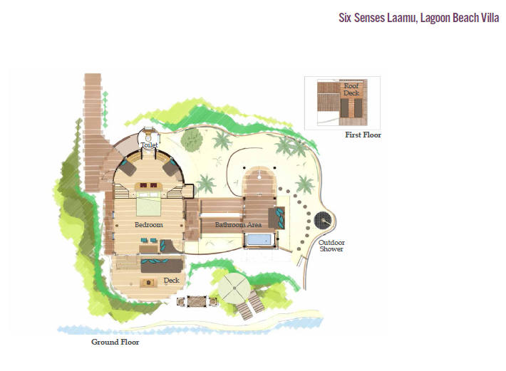 Plážová vilka má přímý přístup k laguně a je situována v soukromém prostředí tropické vegetace. K vilce náleží vlastní zahrada s lehátky, vyhlídková terasa a venkovní otevřená sprcha obklopená bambusovými stěnami. Je vybavena manželskou postelí nebo dvěma oddělenými lůžky.