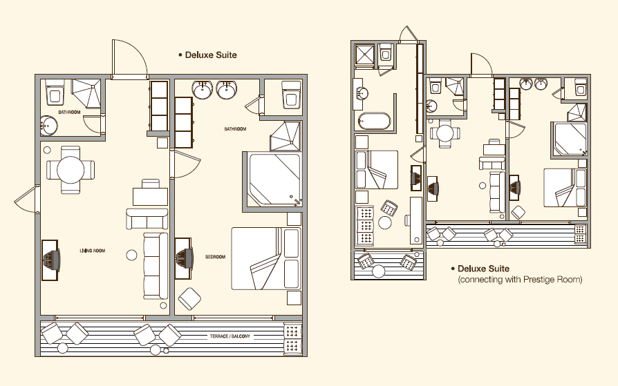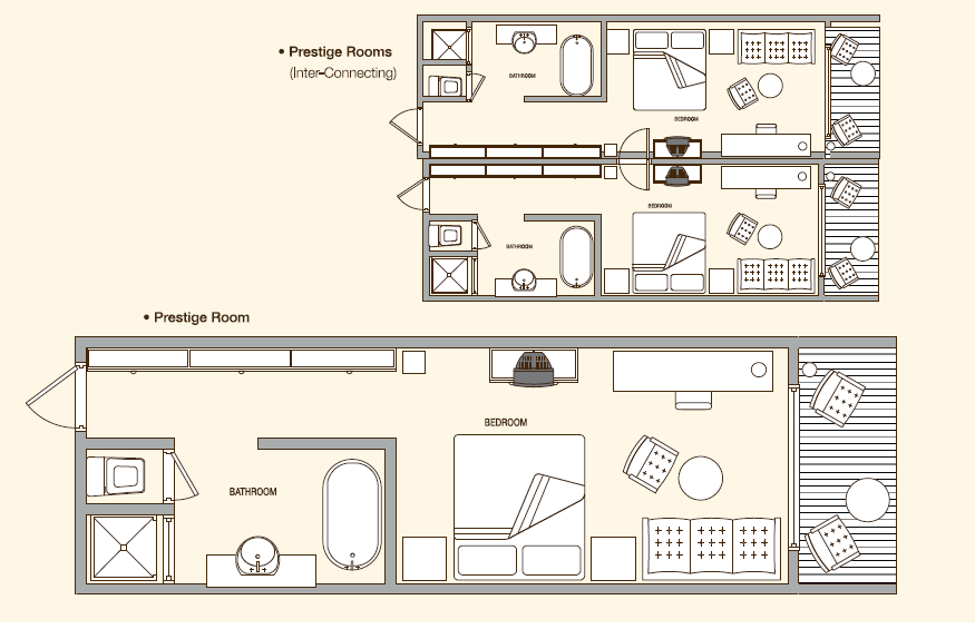 Vybavenie izieb: kúpeľňa so sprchou a vaňou, samostatné WC, fén, kozmetické potreby, župan, papuče, veľká posteľ, pohovka, písací stôl, SAT-TV, Wi-Fi, nastaviteľná klimatizácia, trezor, telefón, minibar, set na prípravu čaju/kávy, kávovar Nespresso, balkón alebo terasa s posedením. V základnej cene je kalkulovaná izba Prestige.