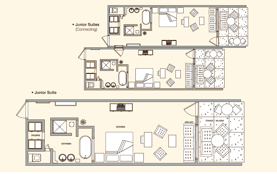 37 komfortných zrekonštruovaných izieb sa nachádza v južnej časti rezortu a majú výhľad na bazén. Pre rodiny je možnosť prepojiť jednotlivé miestnosti a vytvoriť tak priestranný apartmán. Súčasťou je luxusná kúpeľňa so samostatnou vaňou, sprchou, fénom, kozmetickými potrebami, županmi a papučami. V blízkosti sa nachádza reštaurácia La Kaze, ktorá je ideálna k ľahkému občerstvenie kedykoľvek počas dňa. K vybaveniu patrí SAT LCD TV, iPhone dock, minibar, písací stôl, rádio, budík, trezor, telefón a set na prípravu čaju/kávy, kávovar Nespresso a Wi-Fi. Ubytovanie je možné pre 3 dospelé osoby alebo 2 dospelé osoby a 1 dieťa.
