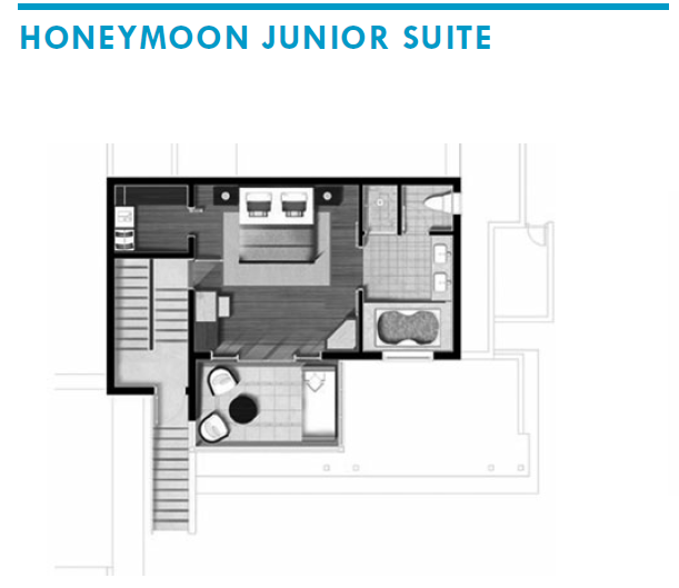 15 romantických izieb je ideálnych pre nezabudnuteľne strávené medové týždne. Je situovaný na prvom poschodí a z balkóna tú môžete pozorovať západ slnka. Spálňa disponuje veľkou manželskou posteľou. K vybaveniu parí HD LCD TV, DVD prehrávač, Wi-Fi, trezor, telefón a set na prípravu čaju a kávy. Izby majú mramorovú kúpeľňu s vírivou vaňou, sprchovým kútom, dvomi umývadlami, WC, bidetom, županmi, papučami a značkovými toaletnými potrebami. Na požiadanie je k dispozícii aj iPod dokovacia stanica. Ubytovanie je možné pre 2 dospelé osoby.