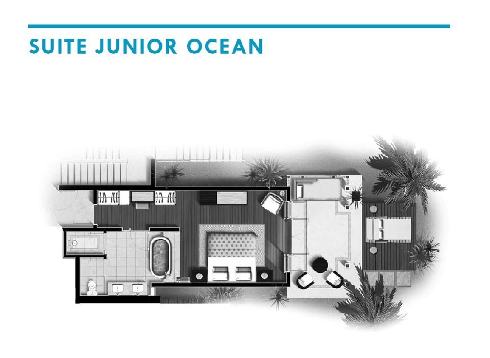 15 elegantných apartmánov s pôvabným výhľadom na oceán a jeho súčasťou je súkromná slnečná terasa s relaxačnými ležadlami. K vybaveniu parí SAT LCD TV, DVD prehrávač, Wi-Fi, trezor, telefón a set na prípravu čaju/kávy a kávovar Nespresso. Štýlová mramorová kúpeľňa je zariadená samostatnou sprchou a hlbokou vaňou s výhľadom na lagúnu. Pre väčšie skupiny je tu možnosť prepojenia apartmánov. Na požiadanie je k dispozícii aj iPod dokovacia stanica. Ubytovanie je možné pre 2 dospelé osoby alebo 2 dospelé osoby a 1 dieťa.