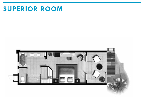64 komfortne zariadených izieb majú podlahy z dreva a balkón so sedením a výhľadom na bujnú exotickú zeleň. K vybaveniu parí SAT LCD TV, DVD prehrávač, Wi-Fi, trezor, telefón a set na prípravu čaju a kávy. Izby majú mramorovú kúpeľňu s vaňou, sprchovým kútom, WC, bidetom, županmi, papučami a značkovými toaletnými potrebami. Ubytovanie je možné pre 3 dospelé osoby alebo 2 dospelé osoby a 1 dieťa.
