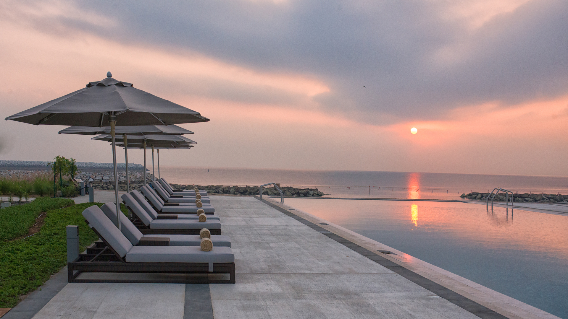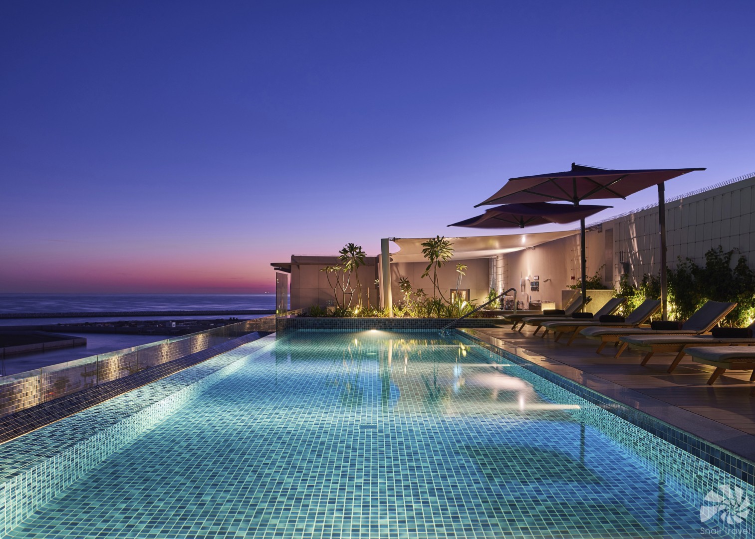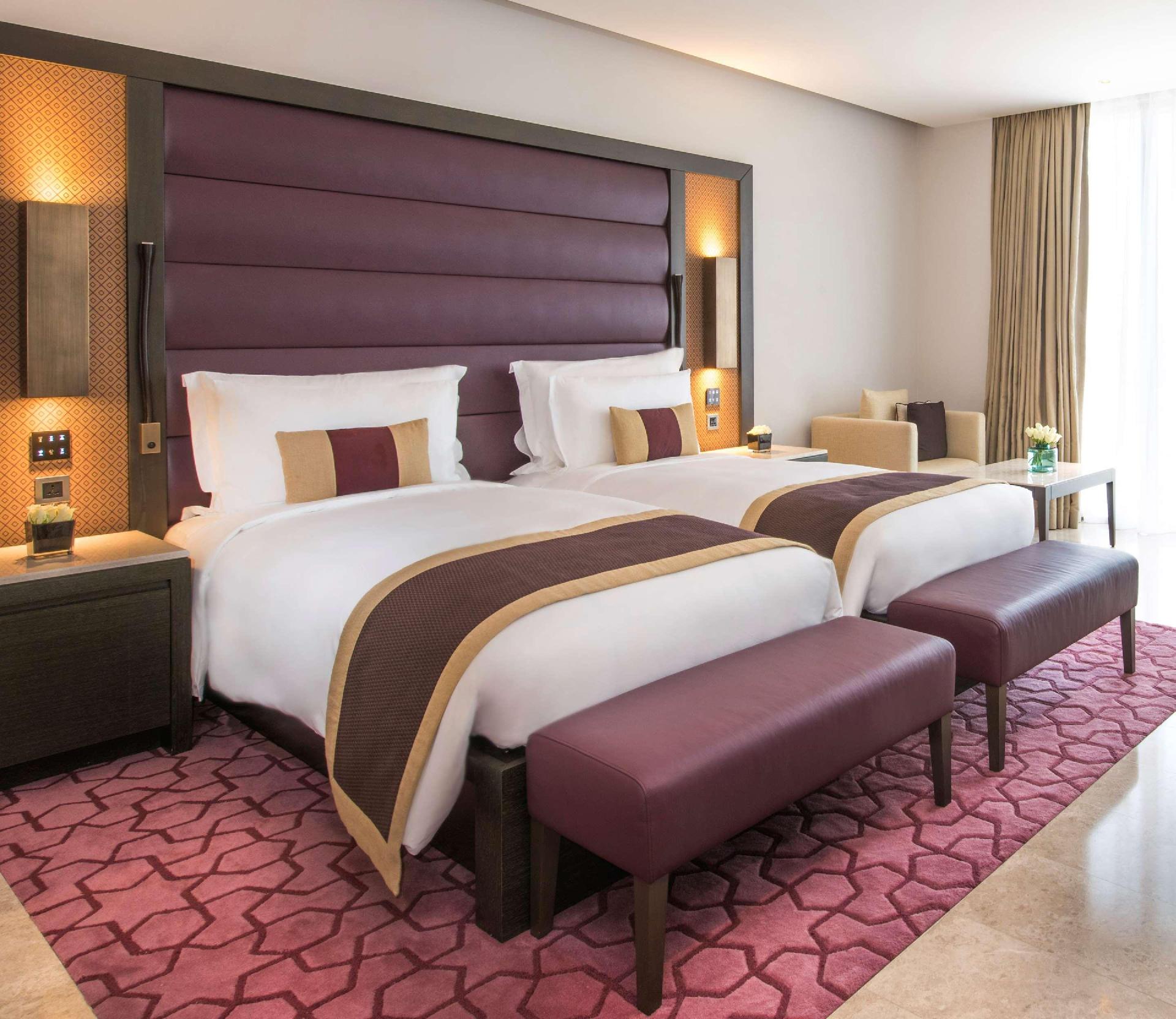 moderní hotel s arabskými prvky leží u pláže v nové rezidenční čtvrti, nabízí velké pokeje a suity. Transfer z letiště trvá 15 minut (10 km), procházkou se dostanete za pár minut chůze do přístavu s promenádou a obchody, cca 700.