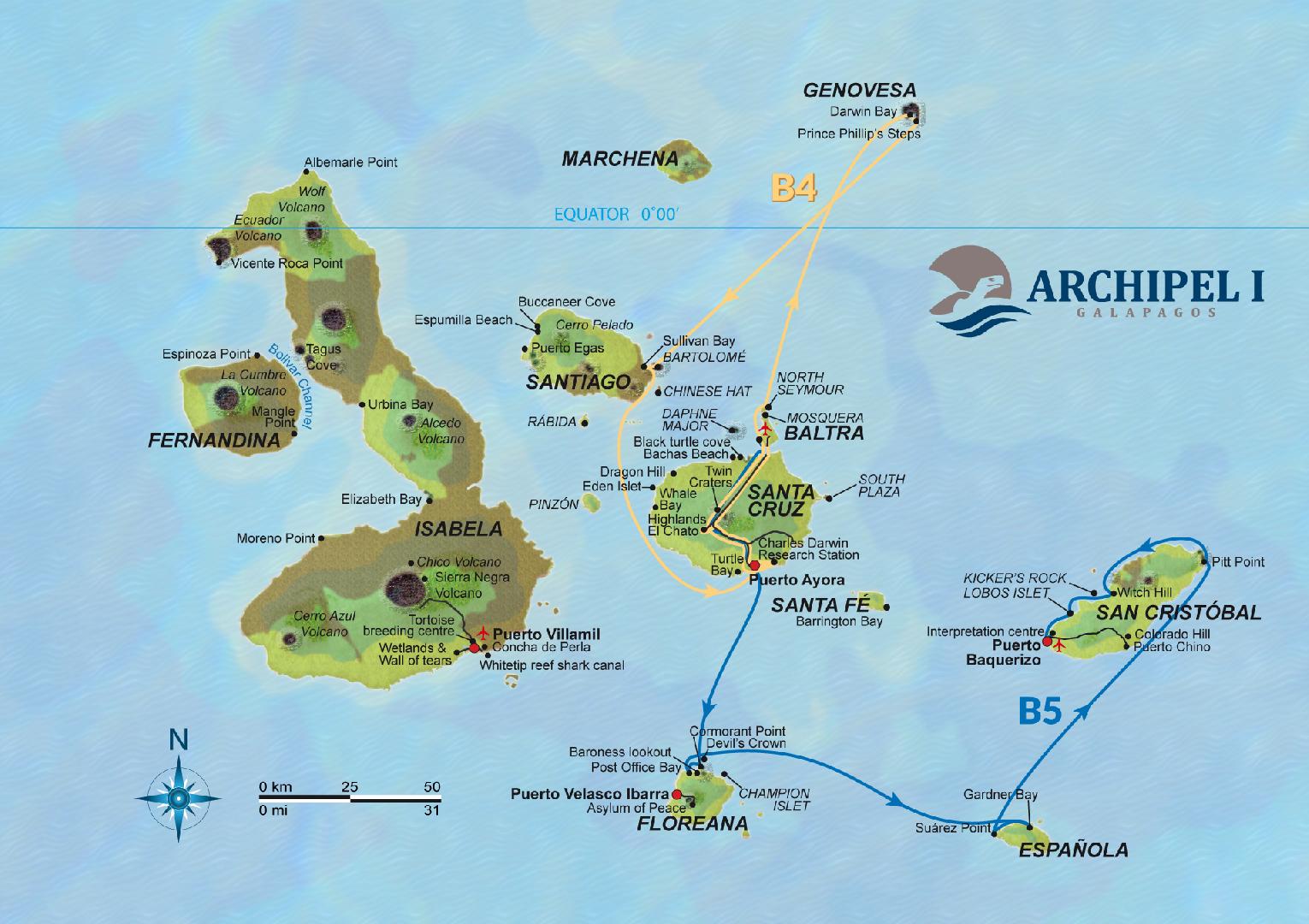Ráno odlet z Guayaquilu na ostrovy Galapágy. Po prílete na ostrov Baltra nasleduje transfer do prístavu a presun na jachtu. Počas celého pobytu na ostrovoch (t.j. 4 noci) bude zaistené ubytovanie na jachte stredne vyššej kategórie, na stabilnom katamaráne Archipel I (kapacita 16 lôžok/ 8 kabín, každá kabína má dve lôžka a vlastné sociálne zariadenie), ktorou sa vyráža na ostatné výlety medzi ostrovmi. K presunom z lodi a výstupom na ostrovy nám poslúžia dva motorové člny typu Zodiac. Naša dobrodružná 5-denná trasa vedie okolo najväčšieho ostrova Isabela, ktorý tvorí reťazec piatich pomerne mladých sopiek. Najvyššia z nich je Volcán Wolf (1.707 m), ktorý je i najvyšším vrcholom celého súostrovia. Ostrov ponúka veľa atrakcií vo vnútrozemí i okolo neho, napr. brakické vody s mangrovníkmi v Humedales, kde bývajú často vidieť plameniaky, Urvina Bay na západnom svahu vulkánu Alcedo je domovom ako morských, tak suchozemských leguánov, tak aj obrích korytnačiek galapágskych a rovnako hniezdiskom kormorána nelietavého. Caleta Tagus s neďalekým jazerom Darwin lake, čo je vlastne slanou vodou zatopený sopečný kužel, Punta Moreno - lávové polia na úpätí sopky Cerro Azul, ktoré sú posiate množstvom lagún. Preskúmame tiež nedotknutý západný koniec Galapág, ostrov Fernandina sa ešte nedávno zrodil z ohňa, čím sa tak staneme očitými svedkami evolúcie. Uvidíme na ňom prvé druhy kolonizujúce neplodné lávové polia. Práve tu je oceán najbohatší na živiny, ktoré sú magnetom pre všetky druhy morských živočíchov a vtákov. Medzi nich patria početné kolónie leguánov morských, tučniaka galapágského, terejov modronohých, fregatiek alebo endemického druhu nelietajúceho kormorána galapágskeho. Cestou späť preskúmame ešte západnú časť ostrova Santiago, ktorá je zaujímavá sopečnými formáciami na pobreží a plážou s čiernym pieskom. Na ostrove Rábida budeme zase obdivovať pláž s červeným pieskom. Na začiatku a na konci našej plavby potom navštívime ostrov Santa Cruz, ktorý pokrývajú svieže zelené vrchoviny. Na nich vo voľnej prírode žijú obrovské korytnačky galapágske. Na tomto ostrove je tiež výskumná stanica Fausto Llerena, nadácie Charlesa Darwina a kancelária národného parku Galapágy. Ochrana prírodného bohatstva ostrovov je pod patronátom UNESCO. Cieľom výskumnej stanice na ostrove je mimo iného podpora a chov miestnych korytnačiek obrích. Tesne pred odletom z Galapág ešte z člnu preskúmame Black Turtle Cove. Pokojná lagúna a okolitý mangrovový les tu umožňujú pozorovanie morských korytnačiek a žralokov. Návšteva týchto izolovaných ostrovov, kde žije množstvo endemitov, patrí k nezabudnuteľným zážitkom všetkých cestovateľov. Počas nášho 5-denného pobytu navštívime 5 z 13 hlavných ostrovov.
