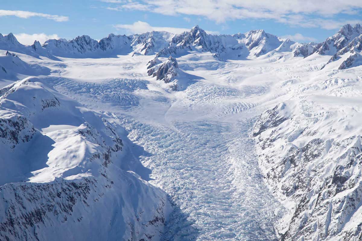 Pozdĺž pobrežia prejazd k ľadovcu Fox Glacier, ktorého spodná časť sa nachádza vo výške 250 m nad morom, a ktorý na svojej 13 km púti k zemi padá z výšky 2.600 metrov. Peší výlet k ľadovcu.
