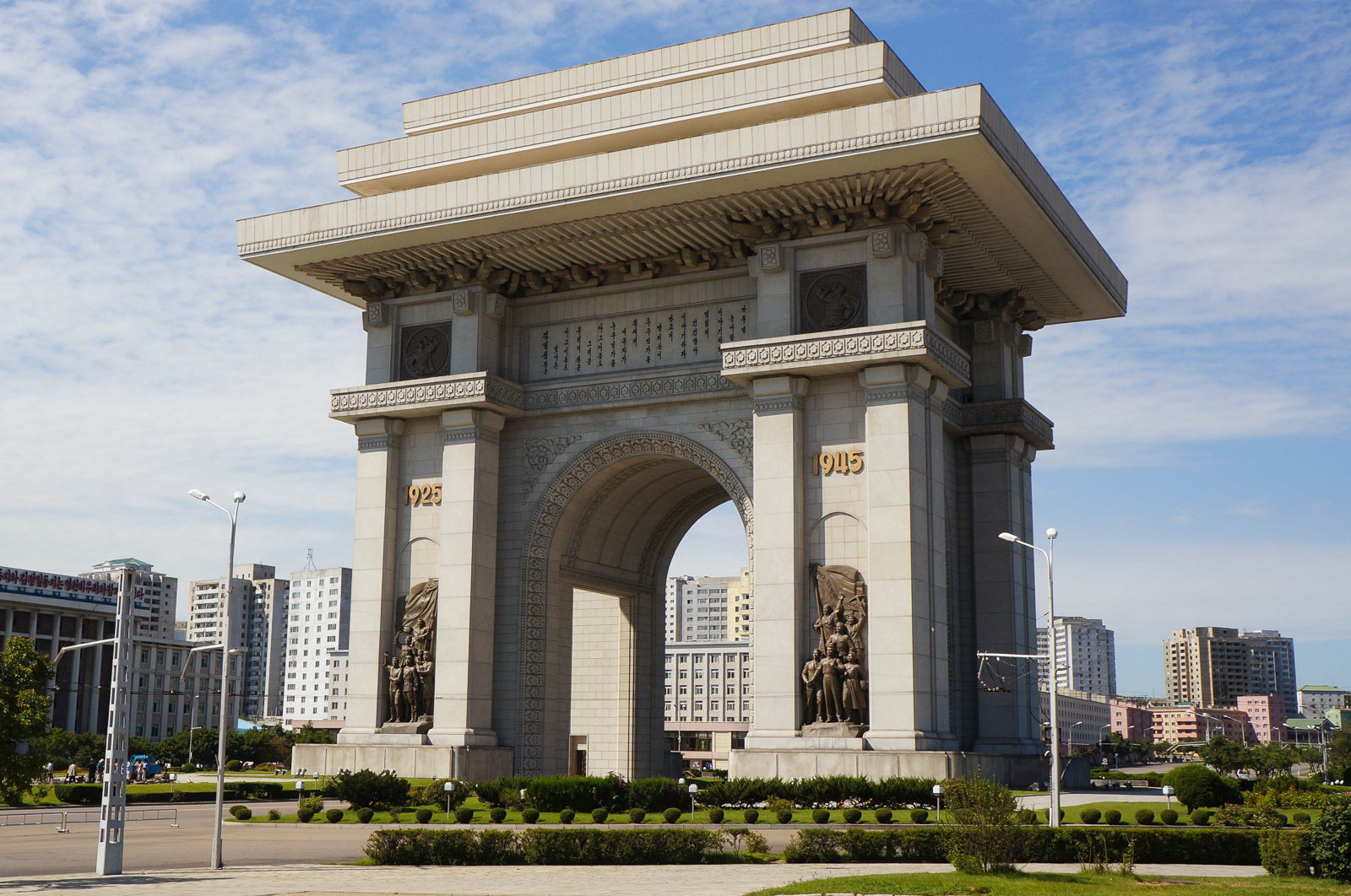 pahorok Mansu s monumentálnou sochou Veľkého vodcu, Víťazný oblúk (samozrejme vyšší ako ten v Paríži).
