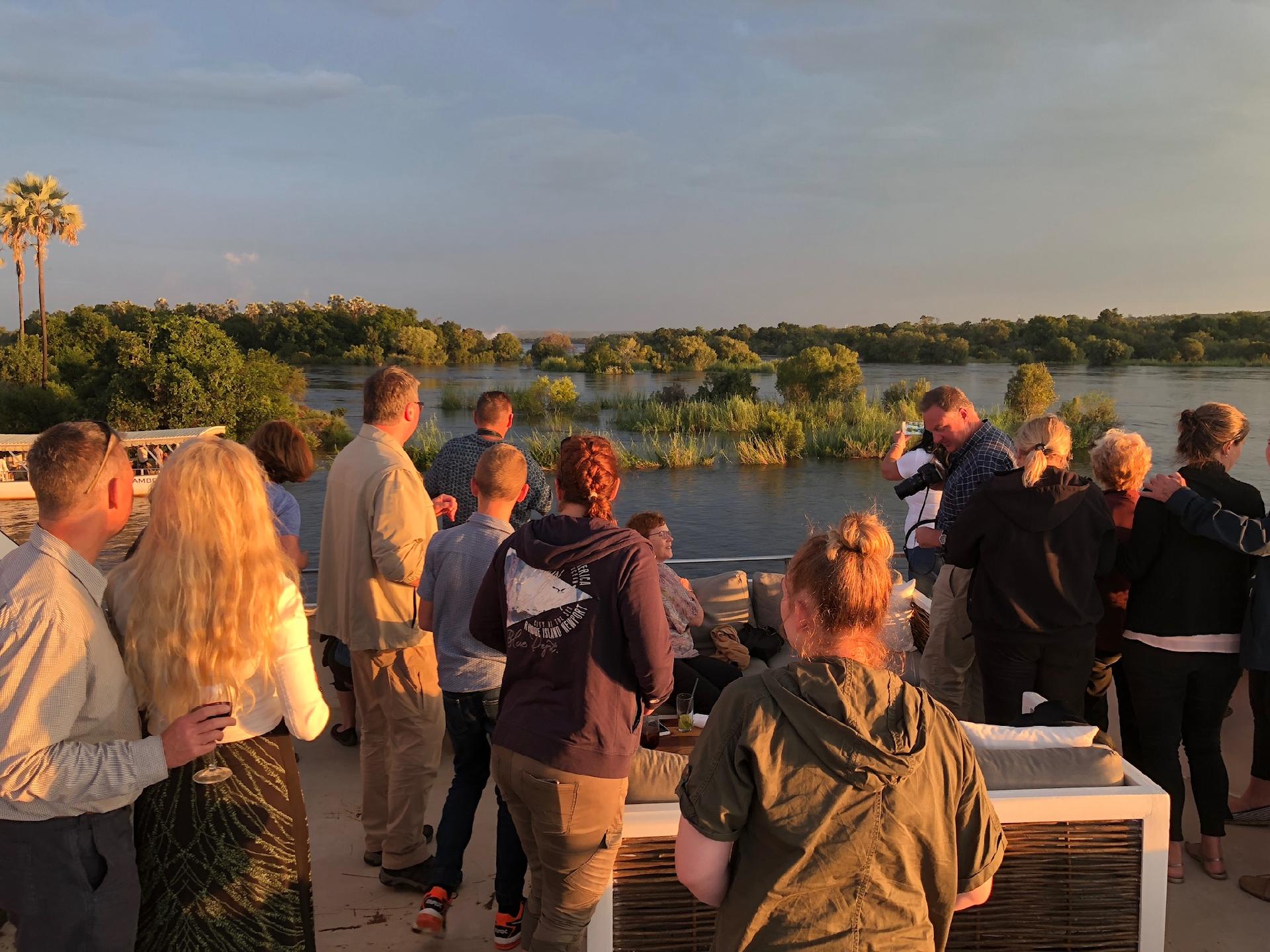 Raňajky. Prehliadka mohutných vodopádov z mnohých nádherných vyhliadok a prakticky všetkých uhlov v sprievode angl. hovoriaceho sprievodcu. Popoludní, respektíve v podvečer je prichystaná výpravná plavba po rieke Zambezi (v cene). V zlatej farbe zapadajúceho slnka, s drinkom niečoho tvrdšieho v ruke - nežné pohlavie iste nepohrdne kokteilom - sa môžeme plne oddať pozorovaniu divokej zveri a hrejivej atmosfére početných delt rieky. Nocľah.